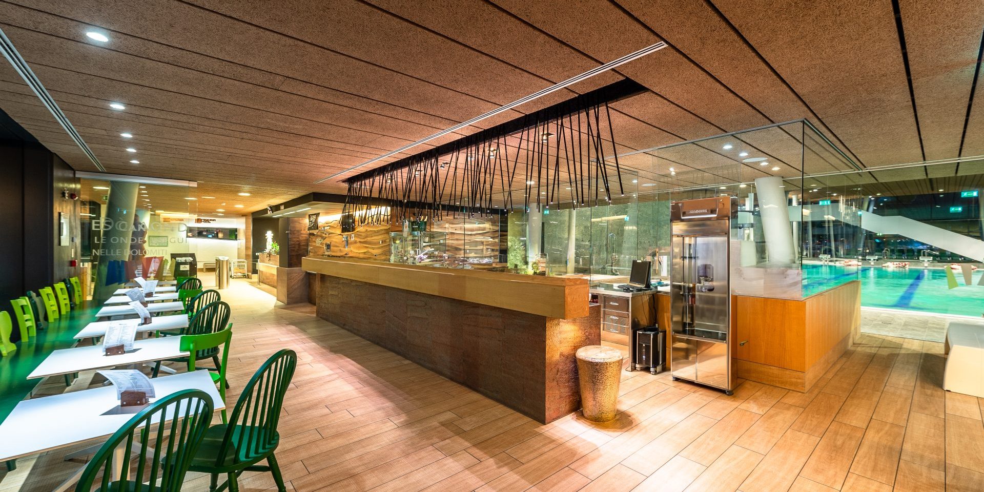 An island of pleasure and a quick pick- me- up, immediate taste and refreshment. A colourful and dynamic area inside Dòlaondes where guests inside are completely isolated from those outside, can take refreshment in different locations whilst enjoying the soothing atmosphere. The benefits of the waves below reach here. A simple, swift refreshment, a healthy drink and the pleasure of good company after an afternoon’s swimming, a purifying sauna, a workout in the gym or simply a hard day’s skiing or walking will inspire you to visit us.